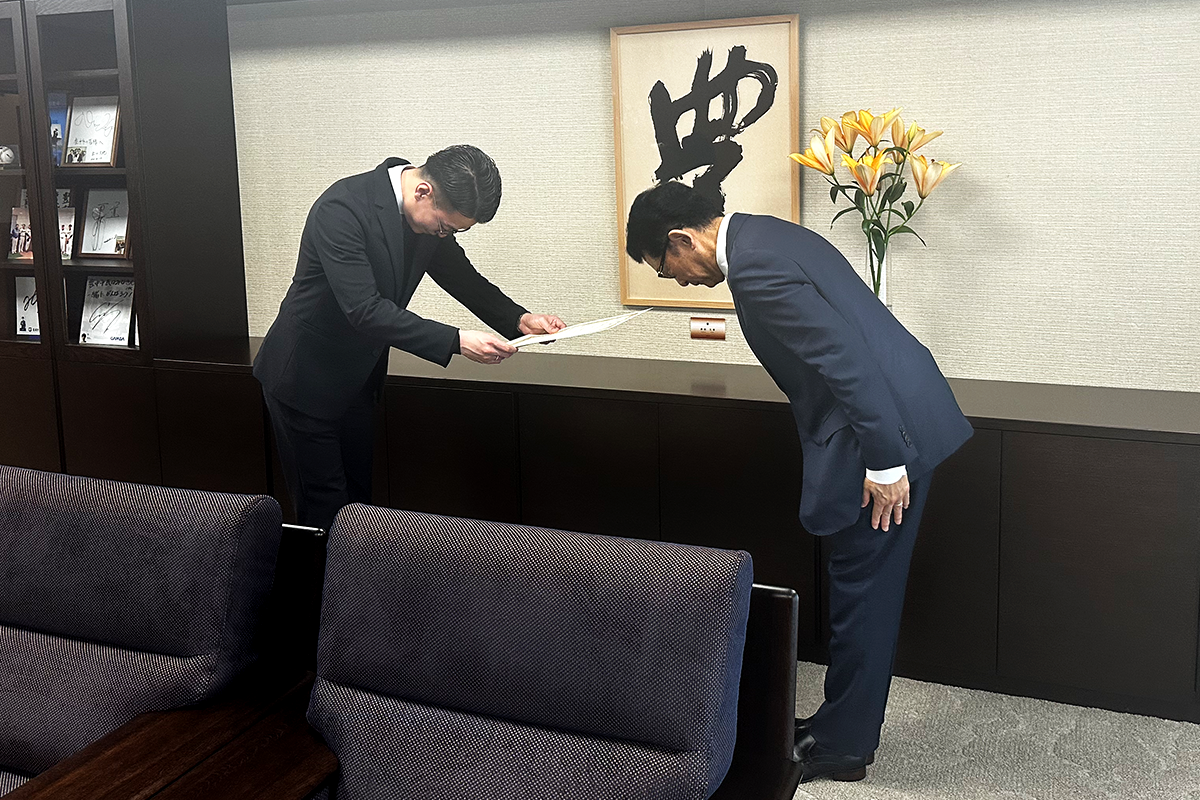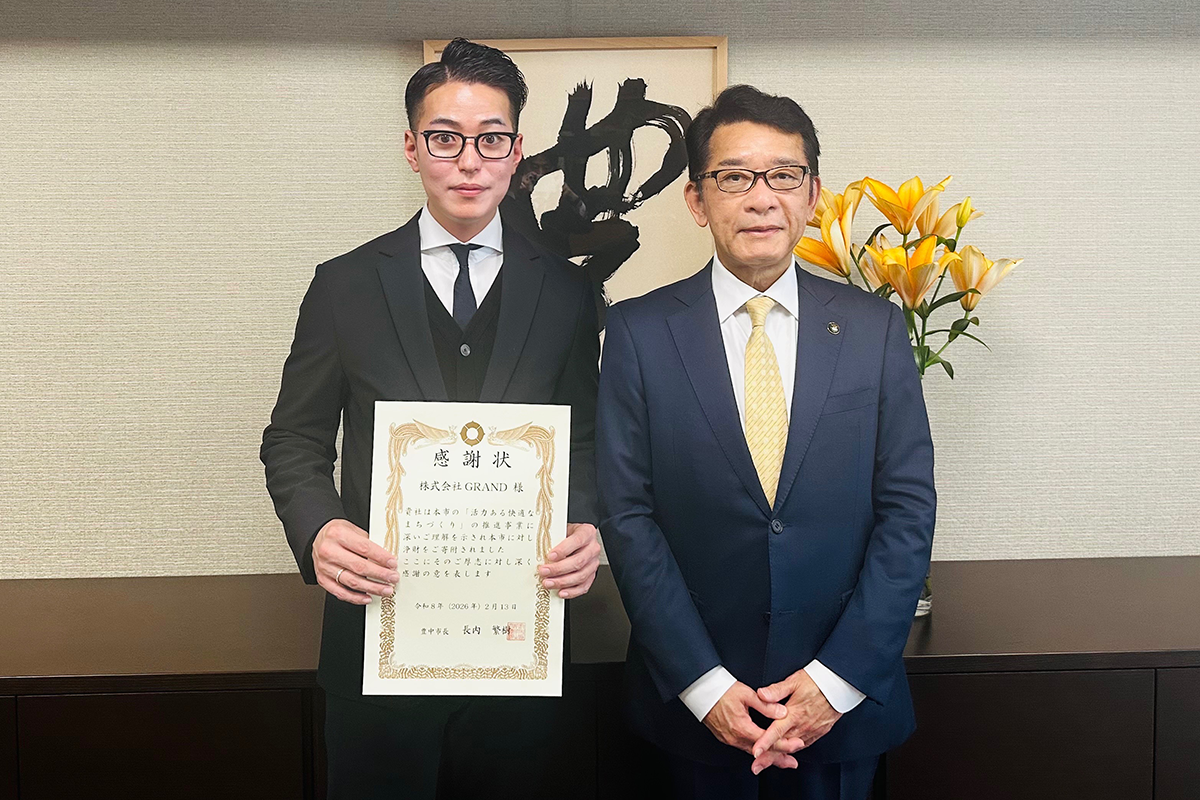 左:GRAND 代表取締役社長 山元、右:豊中市長 長内 繁樹様